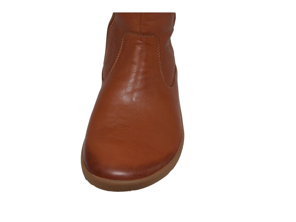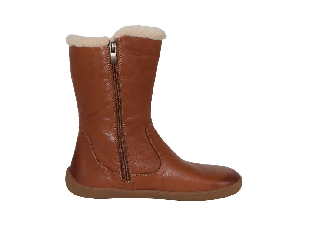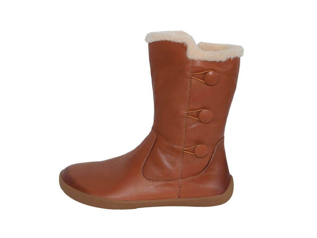 Tyto kozačky jsou v typickém barefoot provedení s rovnou, tenkou podešví a prostornou špičkou. Stélka je kožená, podšívka je středně zateplená. Mají dlouhý zip pro snadné obutí a ozdobné knoflíky na vnější straně. Ozdobný kožíšek na horní straně jim dodává opravdu zimní vzhled.