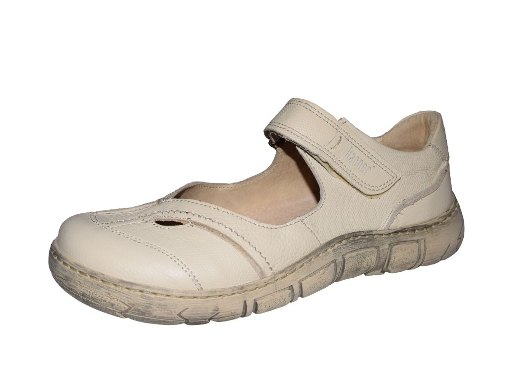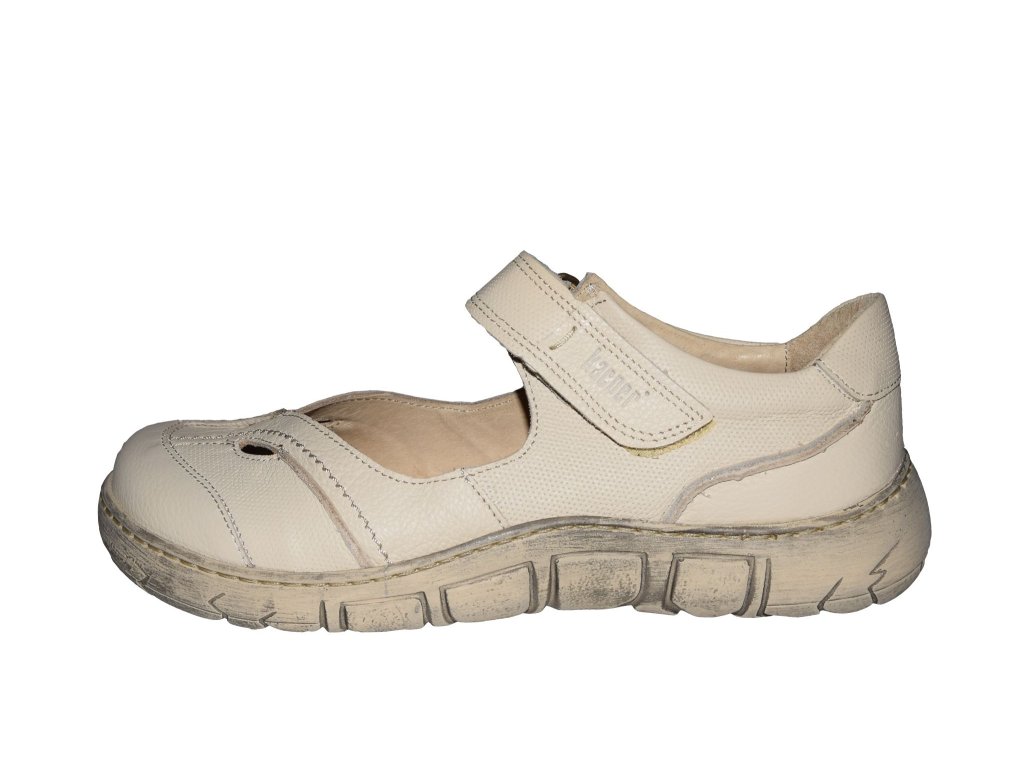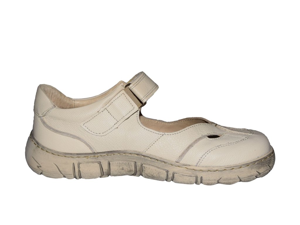 Dámská vycházková obuv Kacper je vyrobena z pravé přírodní kůže. Béžový svršek obuvi je kombinován v hladkém a raženém provedení. Přes nárt je pásek se zapínáním na suchý zip. Nohy se budou cítit pohodlně díky měkké polstrované stélce s perforováním, které přispívá k cirkulaci vzduchu a dobrému klimatu chodidla. Flexibilní podešev má stíraný povrch.