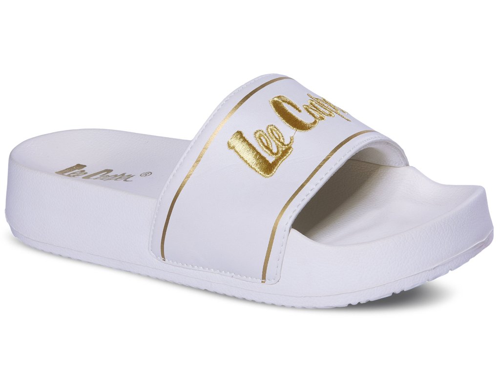 Dámské pantofle mají béžový svršek s výrazným logem Lee Cooper na nártu. Podešev má tvarovanou stélku, podšívka pásku přes nárt má měkkou výplň. Unosíte je doma, na zahradě i na letní dovolené.