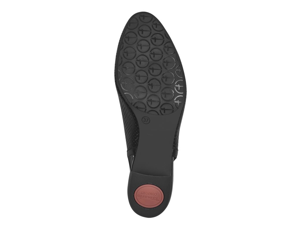 Lodičky s volnou patou zaujmou perforovaným svrškem. Na nízkém, širokém podpatku bude chůze pohodlná a stabilní. Příjemná je kožená stélka s měkkým podkladem. Pásek za patu nastavíte dle potřeby pomocí kovové spony.