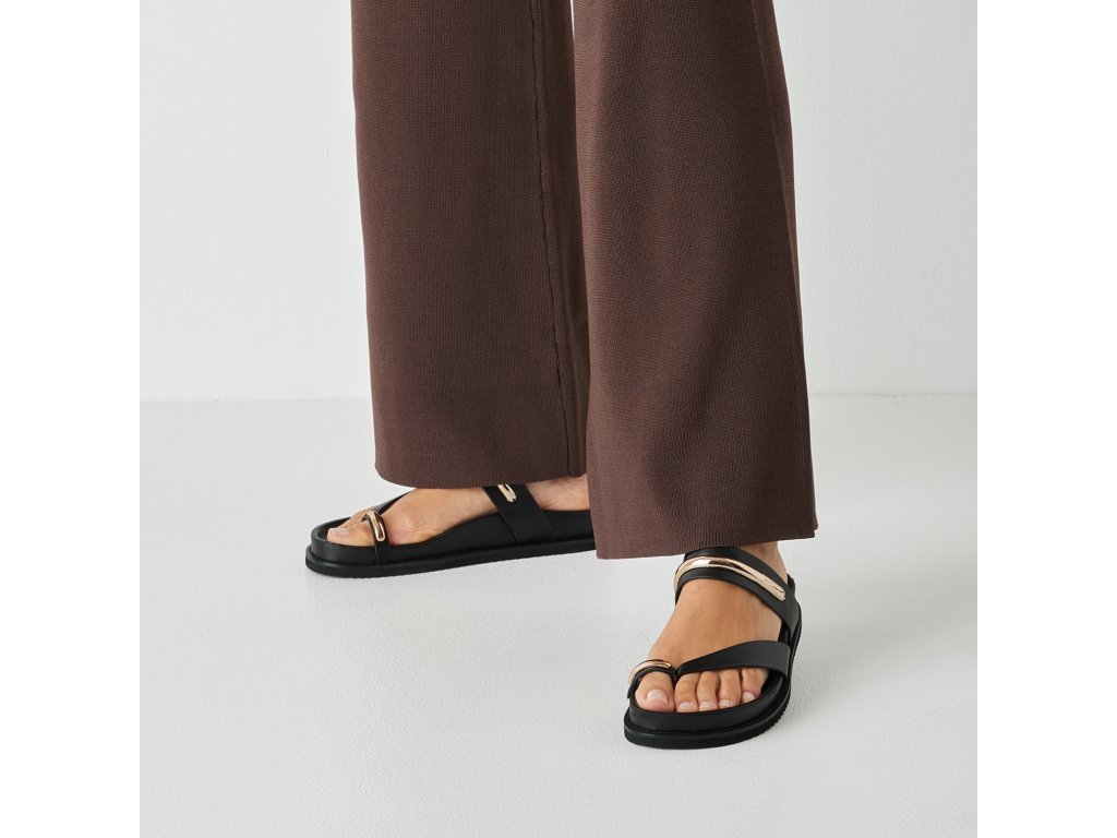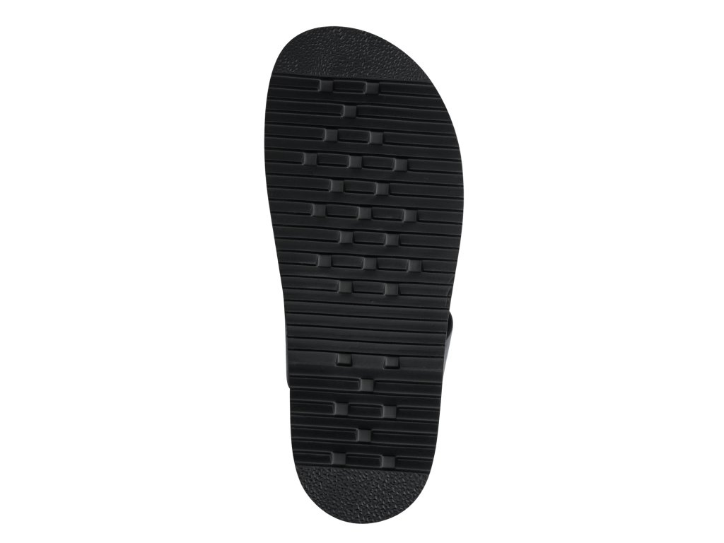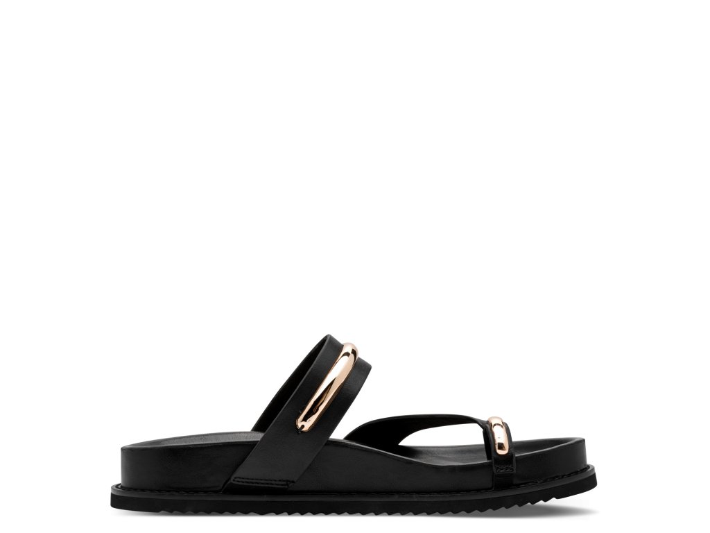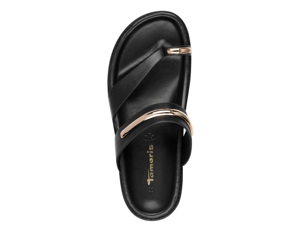 Dámské pantofle Tamaris s černým svrškem jsou v originálním designu, který tvoří pásky se zlatou ozdobou. Pro chodidla je připravena anatomicky tvarovaná podešev s koženým povrchem.