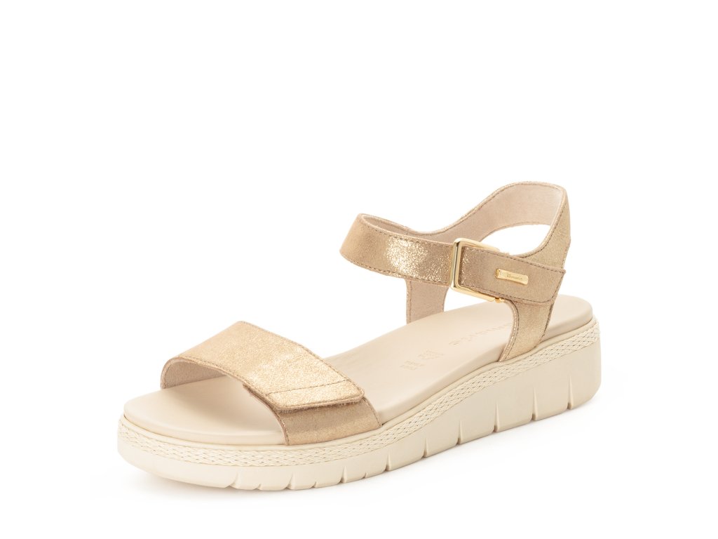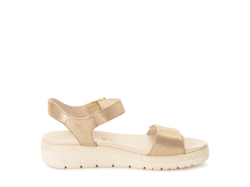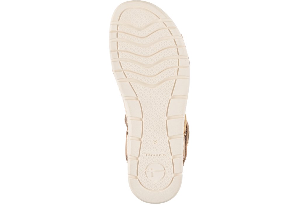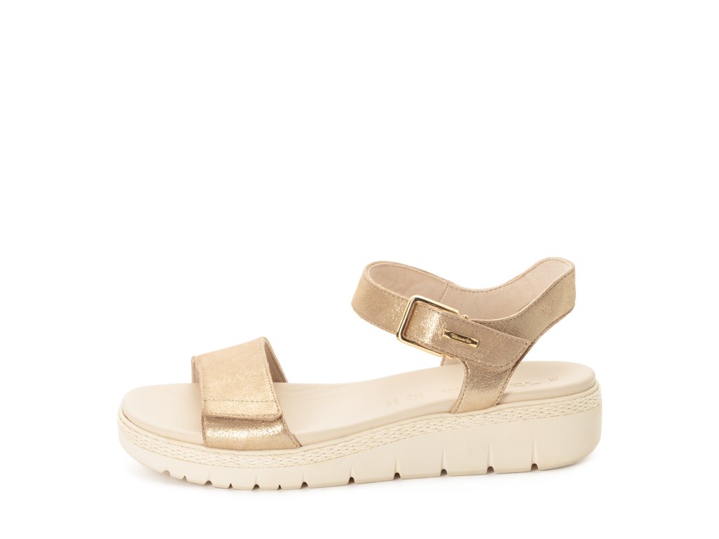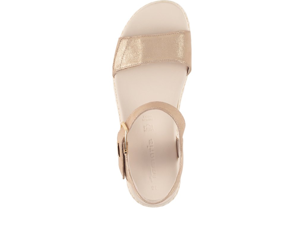 Sandály Tamaris jsou na vyšší podešvi, která zvýší vaši postavu. Mají jednoduchý styl, který vytváří pásky přes nárt a kolem nohy, jsou však zajímavé odstínem šampaňského se třpytem.