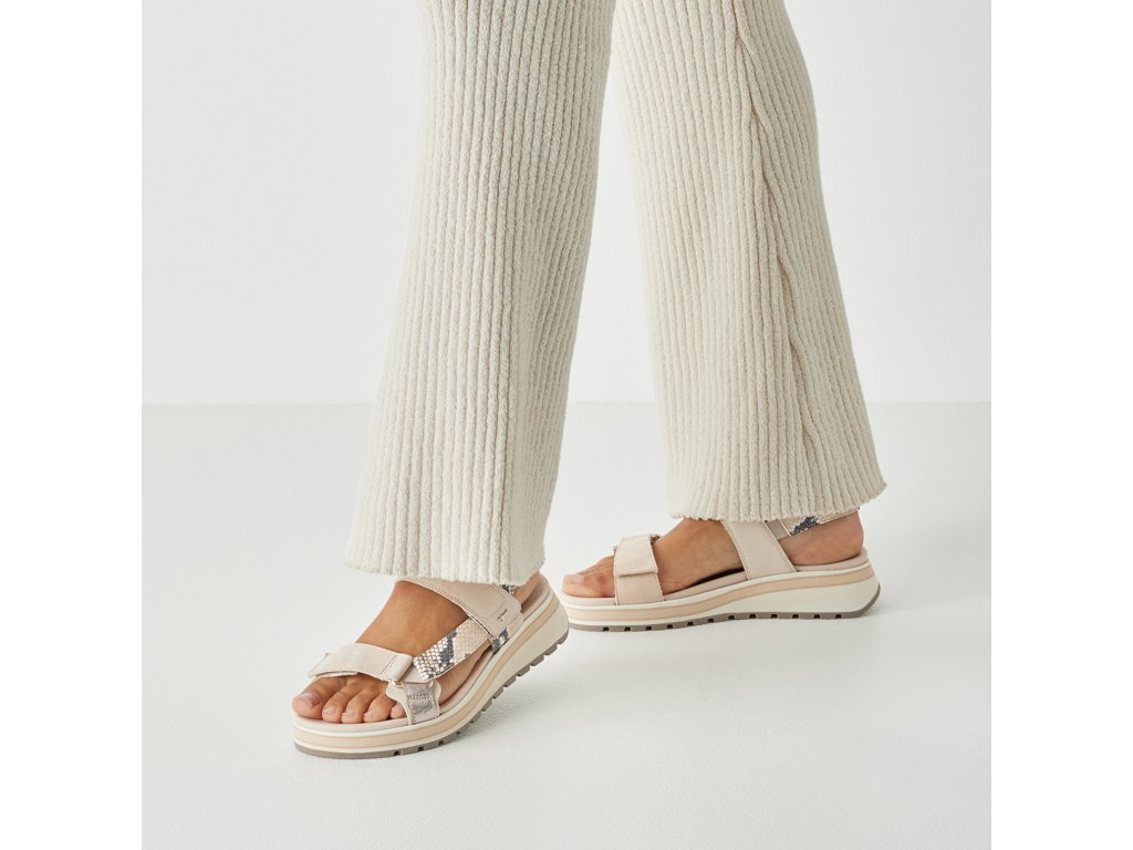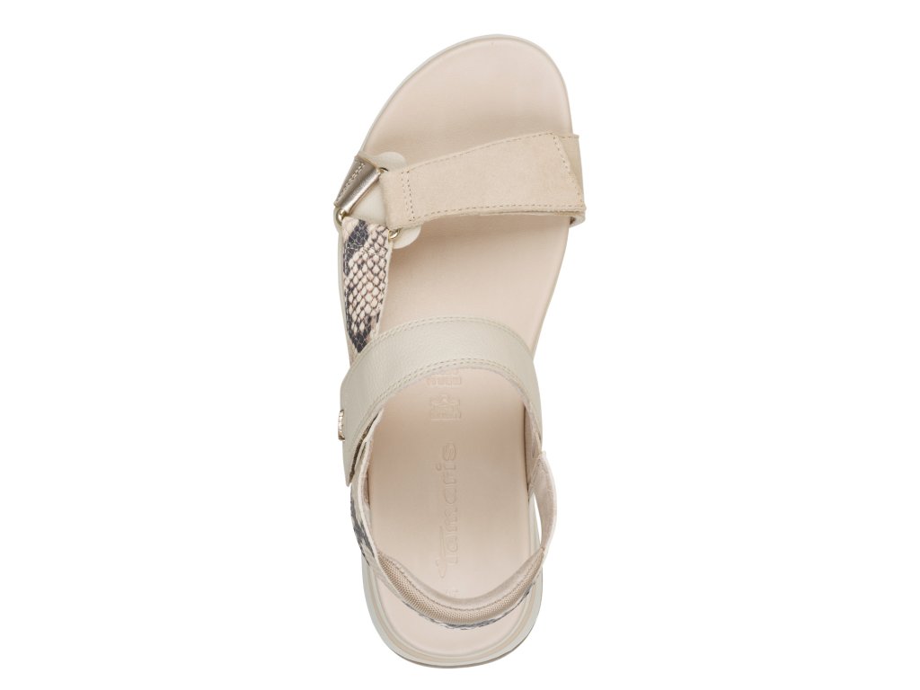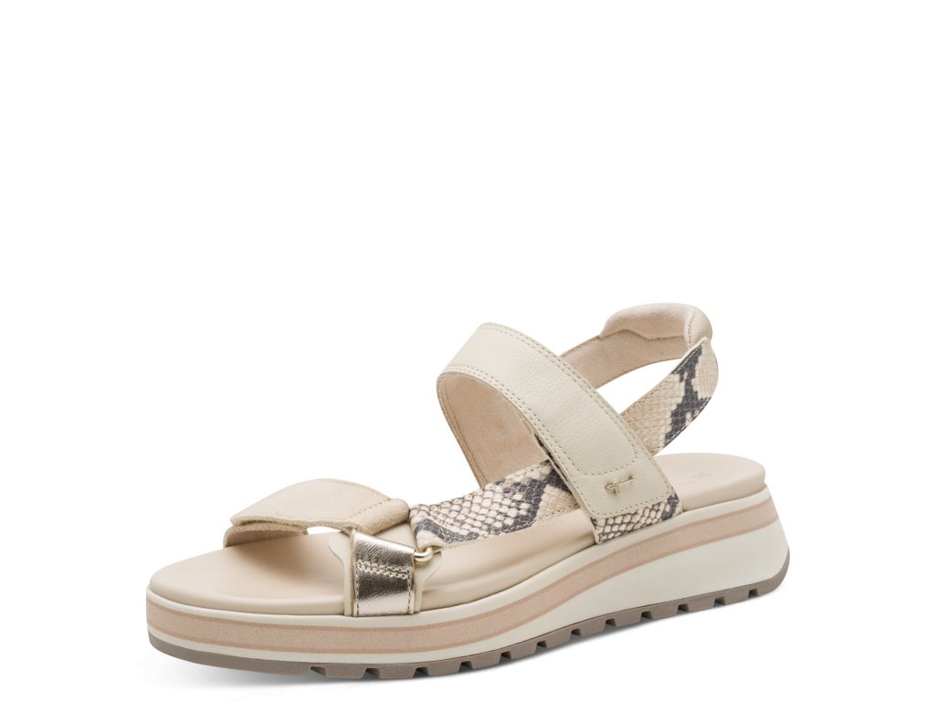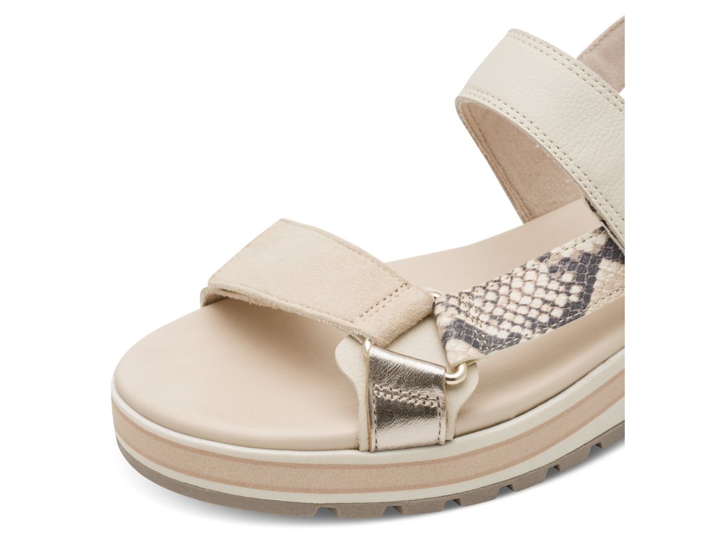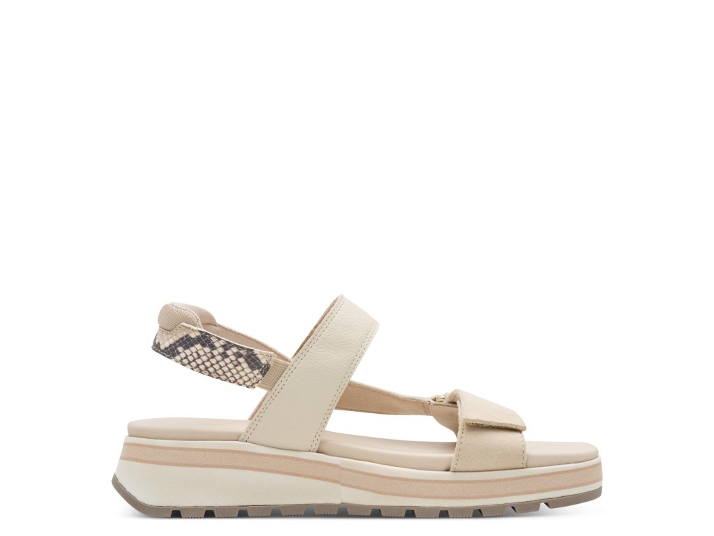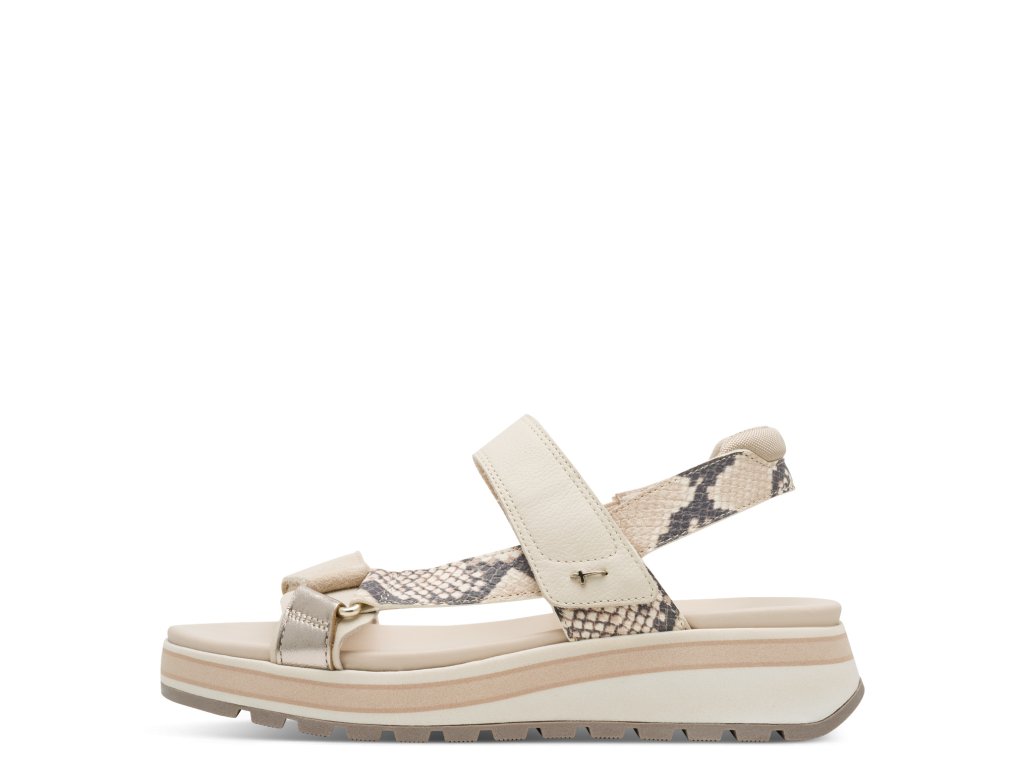 Sandály Tamaris jsou na vyšší podešvi, která zvýší vaši postavu. Jednoduchý styl vytváří jen pásky přes nárt a kolem nohy, oživeny jsou páskem se vzorem hadí kůže. Pásky přes nárt zajistíte pomocí suchých zipů, pásek za patu má bandážování.