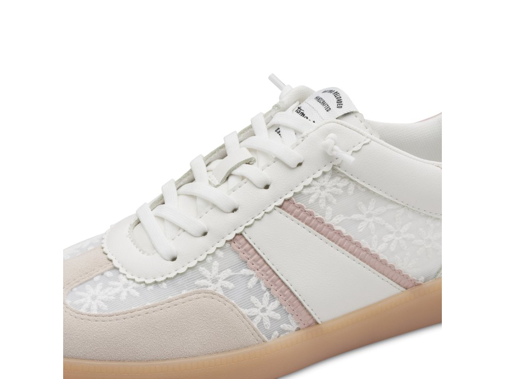 Tenisky Tamaris jsou v originálním provedení, kde části svršku jsou s vyšíváním. Šněrování je z pružných tkanic, takže nazutí bude snadné. Příjemná je měkká stélka a polstrování u kotníků.