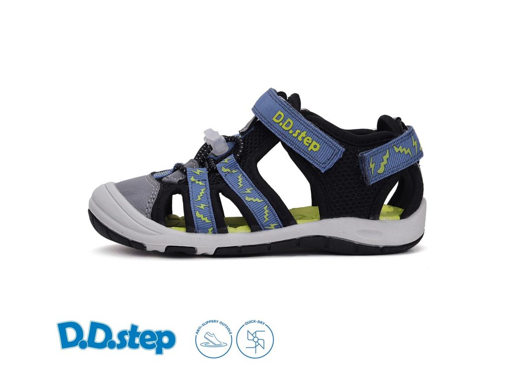 Chlapecké sandály D.D.step mají svršek oživený modrožlutými detaily. V plné patě se chodidlo pevně usadí a suchým zipem zajistí. Mají plnou špičku, čímž jsou prsty dobře chráněny. Podešev je velice flexibilní, stélka měkká z polyuretanové pěny.