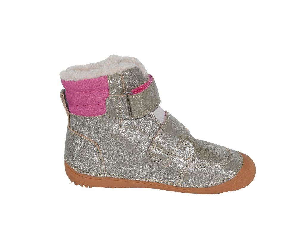 Zimní dívčí obuv má podešev typu Barefoot simulující chůzi na boso. Svršek je kožený, pro prsty je dostatečně široký prostor, aby nebylo bráněno zdravému vývoji. Výhodou je zvýšený okraj špice bránící okopu. Zapínání na suché zipy umožňuje dostatečné rozevření obuvi a snadné obutí. Uvnitř jsou zatepleny silným kožíškem i na stélce a proto budou nohy v teple. Originální jsou svrškem v šampaňském odstínu se třpytem a s výraznými barevnými detaily.