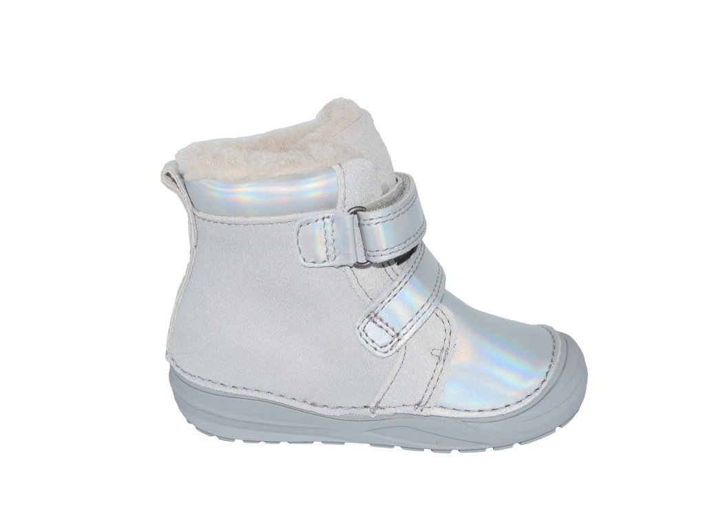 Dívčí obuv je střihem ve vyšším provedení nad kotníky, kde vykukuje silný kožíšek, kterým je tato obuv zateplená na podšívce i stélce. Zapíná se na suché zipy a po jejich rozepnutí noha snadno vklouzne dovnitř. Špice je dostatečně široká, aby prsty měly dostatek prostoru a mohly se zdravě vyvíjet. Podešev je tenká, flexibilní, pod patou má soft shock pro tlumení nárazů při došlapu. Svršek září perleťovým třpytem.