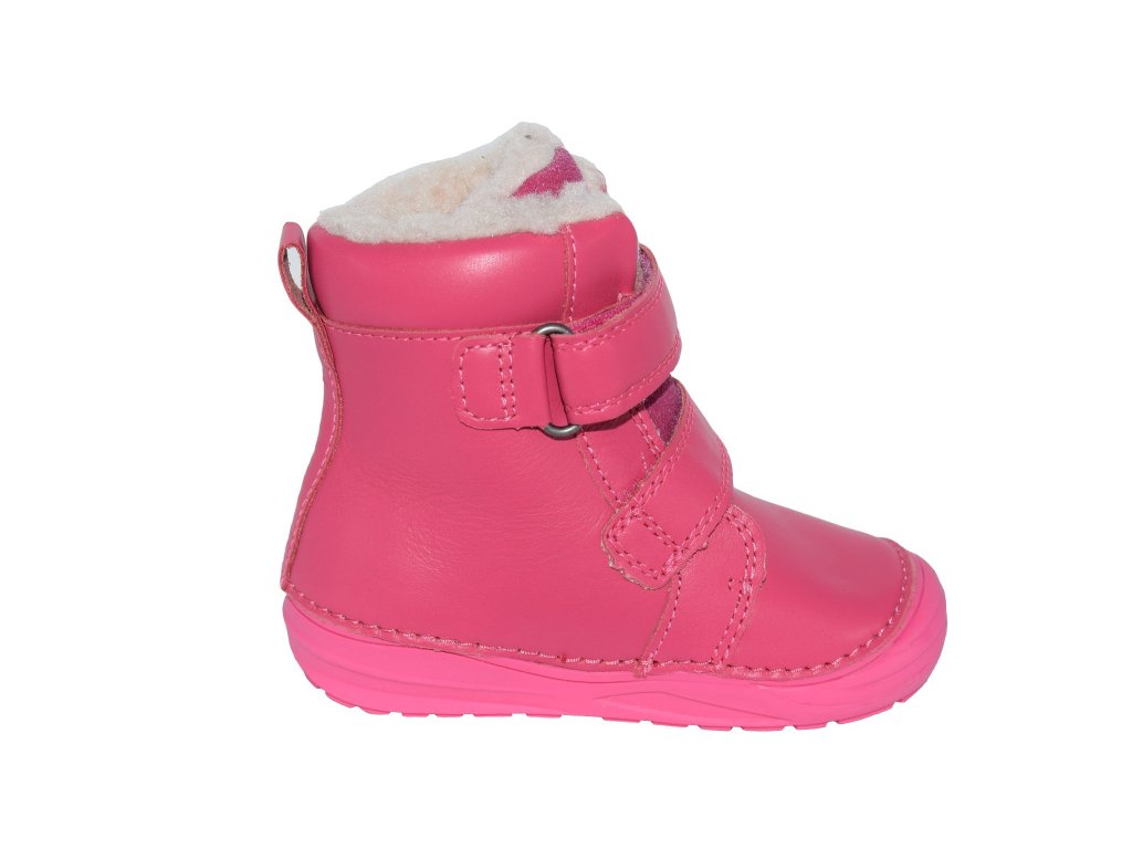 Dívčí obuv je střihem ve vyšším provedení nad kotníky, kde vykukuje silný kožíšek, kterým je tato obuv zateplená na podšívce i stélce. Zapíná se na suché zipy a po jejich rozepnutí noha snadno vklouzne dovnitř. Špice je dostatečně široká, aby prsty měly dostatek prostoru a mohly se zdravě vyvíjet. Podešev je tenká, flexibilní, pod patou má soft shock pro tlumení nárazů při došlapu. Svršek září výrazným růžovým odstínem.