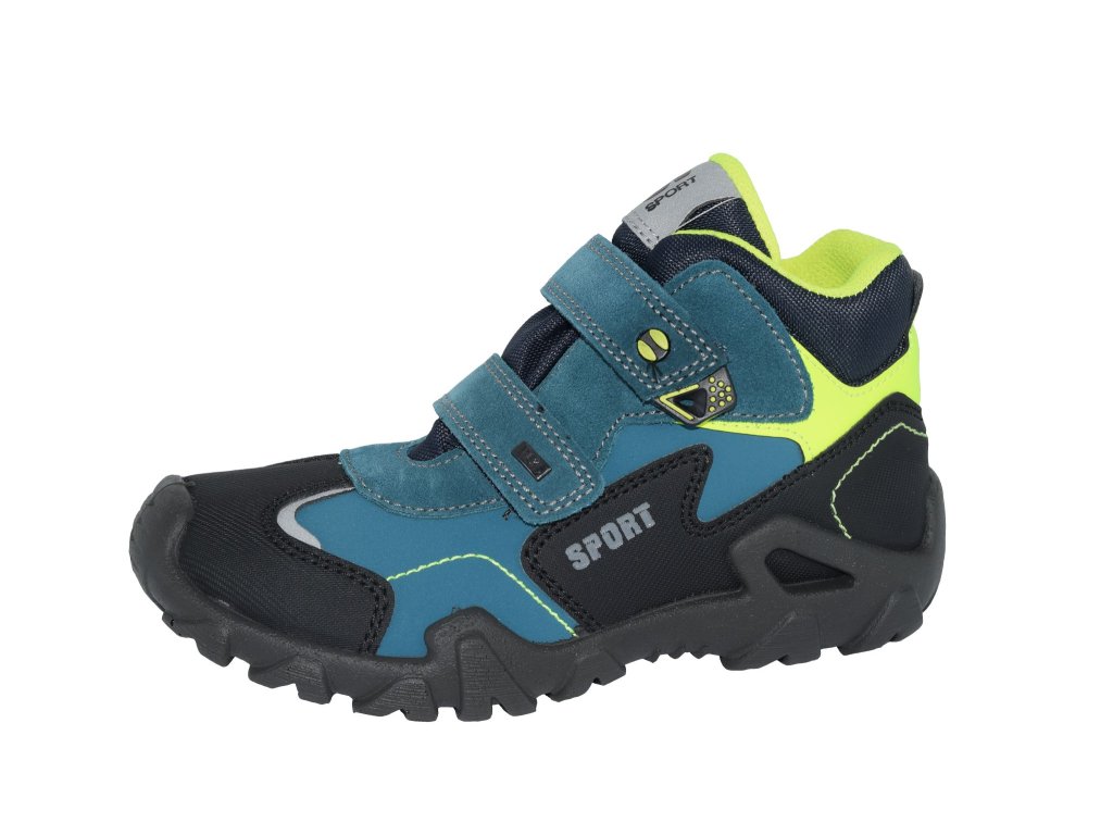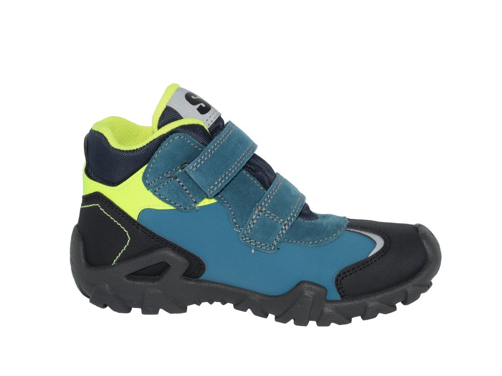 Chlapecká obuv má design v outdoorovém stylu a je vhodná pro lehkou turistiku, venkovní aktivity i pro nošení ve městě. Modrý svršek je doladěn žlutými detaily. Tato obuv má zpevněnou podešev se zvýšenou špicí a opatkem, zapínání je na suché zipy.