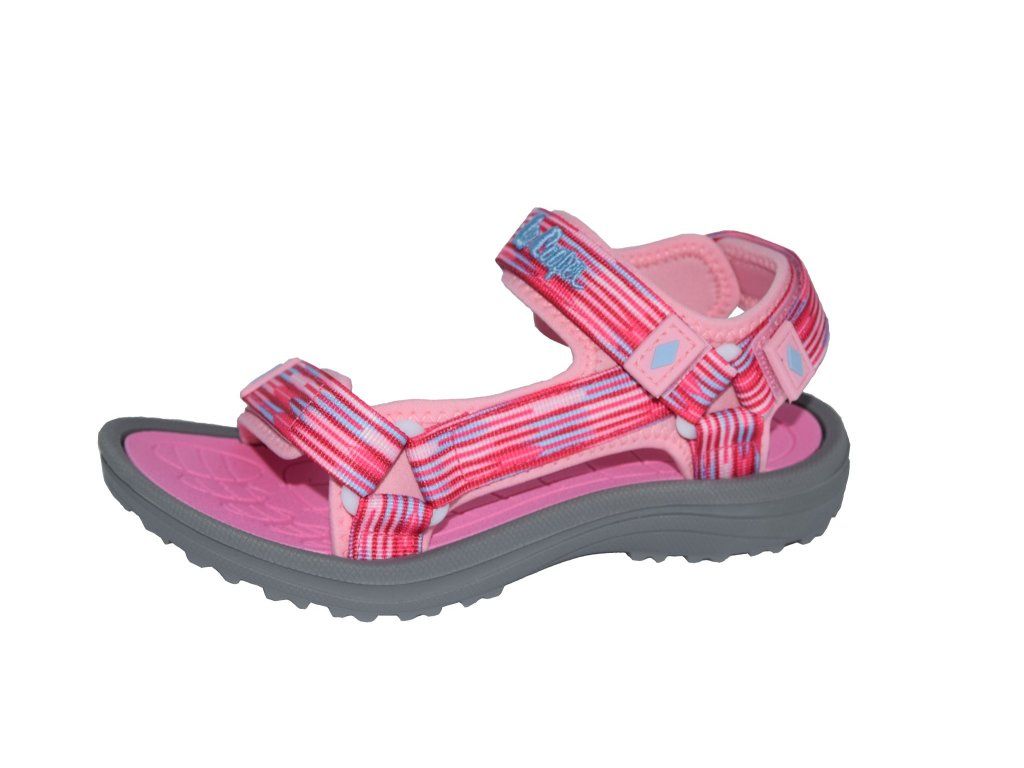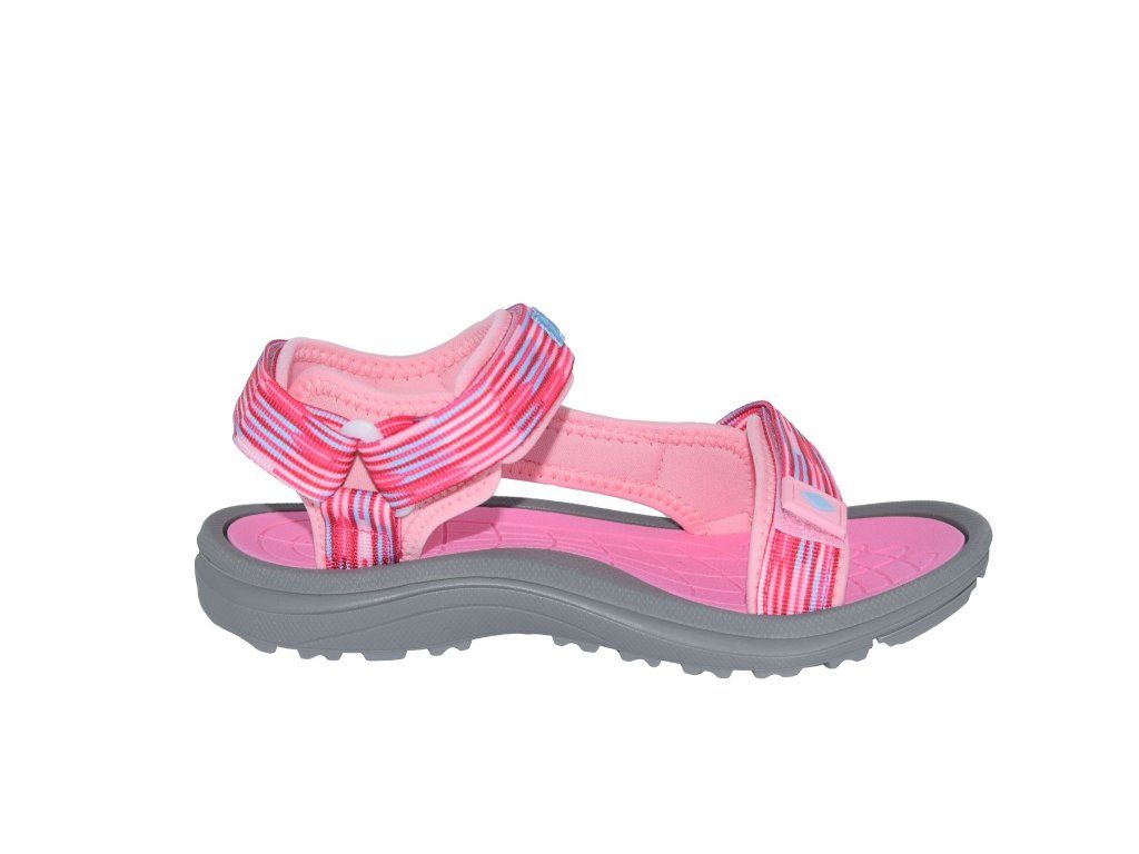 Dívčí sandály pro to nejteplejší léto mají svršek tvořený jen z textilních pásků v zajímavé barevné kombinaci. Všechny pásky lze přenastavit dle potřeby díky suchému zipu. Pásky jsou podšité příjemným tenkým polstrováním. Podešev je se vzorkem, syntetické stélce nevadí, když navlhne.