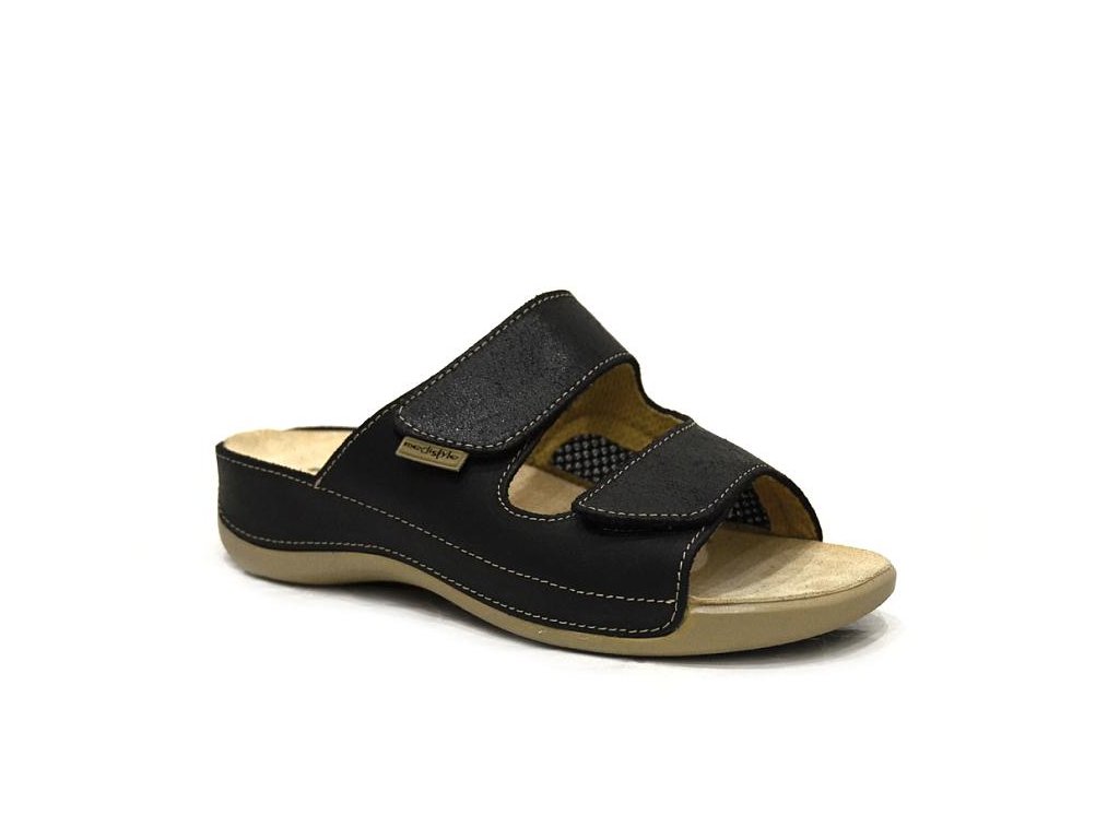 Pohodlné pantofle Medistyle jsou v černé barvě. Svršek obuvi je ze dvou lícových hovězinových kožených pásků. Pásky jsou na suchý zip. Na vnitřní straně je všitá pružná textilní síťka – vhodná na halux. Obuv je vhodná pro vysoký nárt a širší chodidlo. Stélka je anatomicky tvarovaná, taktéž kožená. Po navlhnutí je nutné nechat stélku přirozeně vyschnout. Podešev absorbuje nárazy vznikající při došlapu a chrání tak Vaše klouby a záda. Podešev je protiskluzová. Obuv je vhodná jako přezůvky do práce i na doma.