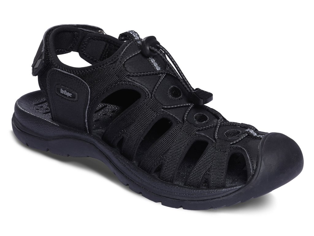 Sandály Lee Cooper jsou v outdoorovém stylu s plnou špicí chránící prsty. Nazouvají se po rozepnutí pásku za patou, na nártu mají pružné tkanice. Stélka je pružící a tlumí došlap, podešev je flexibilní.