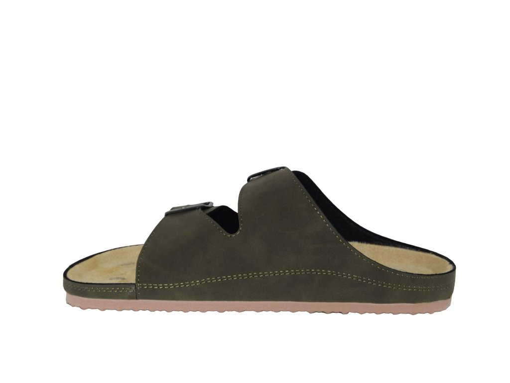 Pohodlné pantofle MEDI LINE mají svršek v tmavě zeleném odstínu, přes nárt mají dva pásky se sponou na seřízení. Stélka je anatomicky tvarovaná, kožená, s množstvím masážních bodů a tlumením nárazů pod patou. Pantofle jsou vhodné jako přezůvky do práce, do školy i na doma.